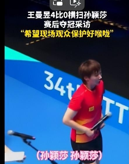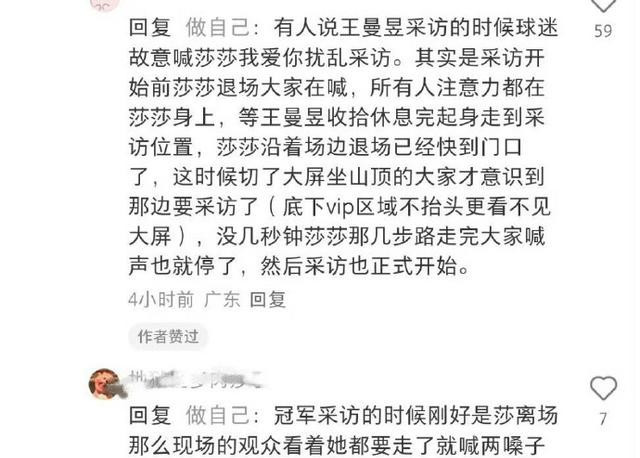 有网友表示,在王曼昱接受采访时,球迷在观赛台上大喊大叫,一直喊着“孙颖莎加油”。