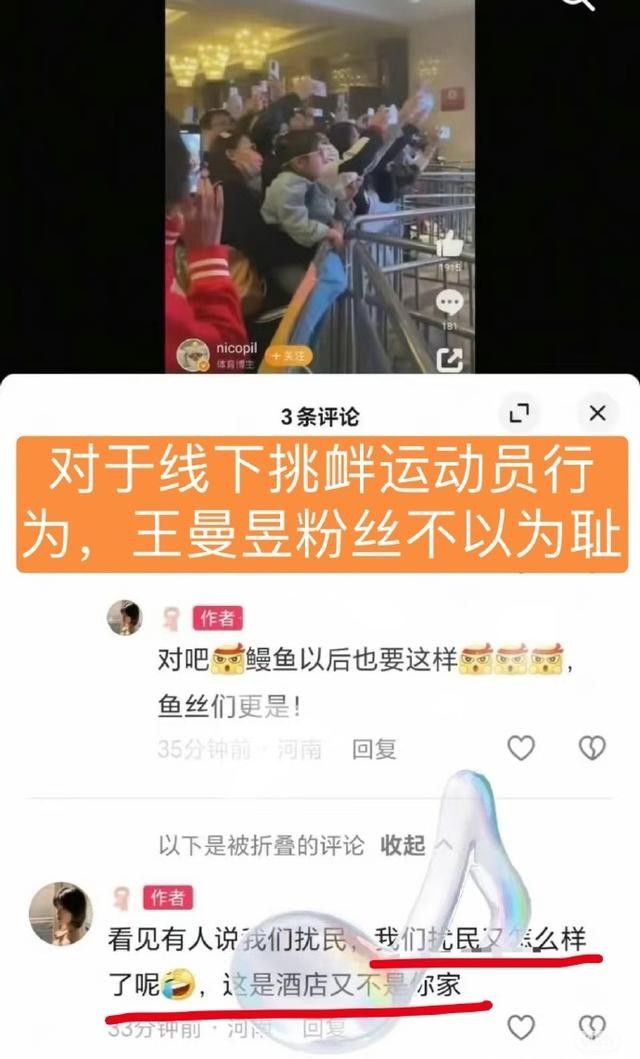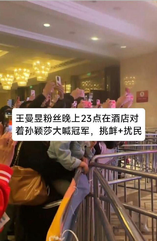同时,也有网友放出比赛结束后,有粉丝追到酒店,对孙颖莎大喊“王曼昱是冠军”,甚至还在酒店大堂大喊,造成扰民事故。